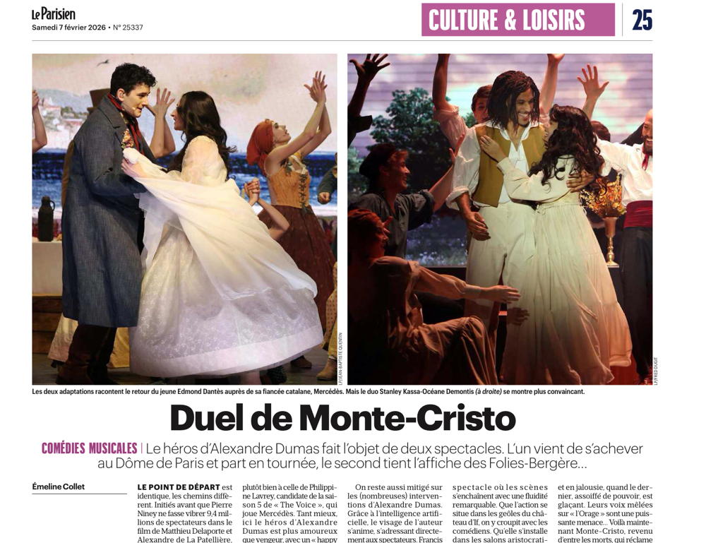 Comment? Vous n’êtes pas allé voir les deux comédies musicales Monte-Cristo lancées le mois dernier à Paris (voir ci-dessous les posts des 24 et 29 janvier)? Ça tombe bien, Le Parisien l’a fait pour vous et s’est livré à la comparaison dans une pleine page de son numéro du 7 février. Avec un verdict clair et net… Sur La légende de Monte-Cristo montée au Dôme de Paris et désormais en tournée, le jugement est mitigé. « Peu de drame, beaucoup de larmes », estime le journal qui, tout en louant les qualités de chanteur de l’interprète du rôle titre, souligne qu’il est « bien moins à l’aise sur le terrain de l’interprétation, son Monte-Cristo semble parfois bien empoté ». Le Parisien déplore aussi les trop nombreuses interventions d’un Alexandre Dumas animé par une intelligence artificielle, un « objectif louable », mais avec un résultat qui « appesantit le spectacle, déjà assez lent ». Tonalité toute différente pour Monte-Cristo, le spectacle musical présenté aux Folies Bergère avant de partir lui aussi en tournée. « Quel panache! », lance Le Parisien qui salue la qualité des décors, le talent des acteurs principaux et une mise en scène astucieuse. « C’est léger, vif, malin, avec une tension tenue de bout en bout. Ce ‘Monte-Cristo’ a de l’élan et un souffle certains. Entre justice et vengeance, on est bien là dans l’esprit du roman d’aventures d’Alexandre Dumas », conclut le quotidien.