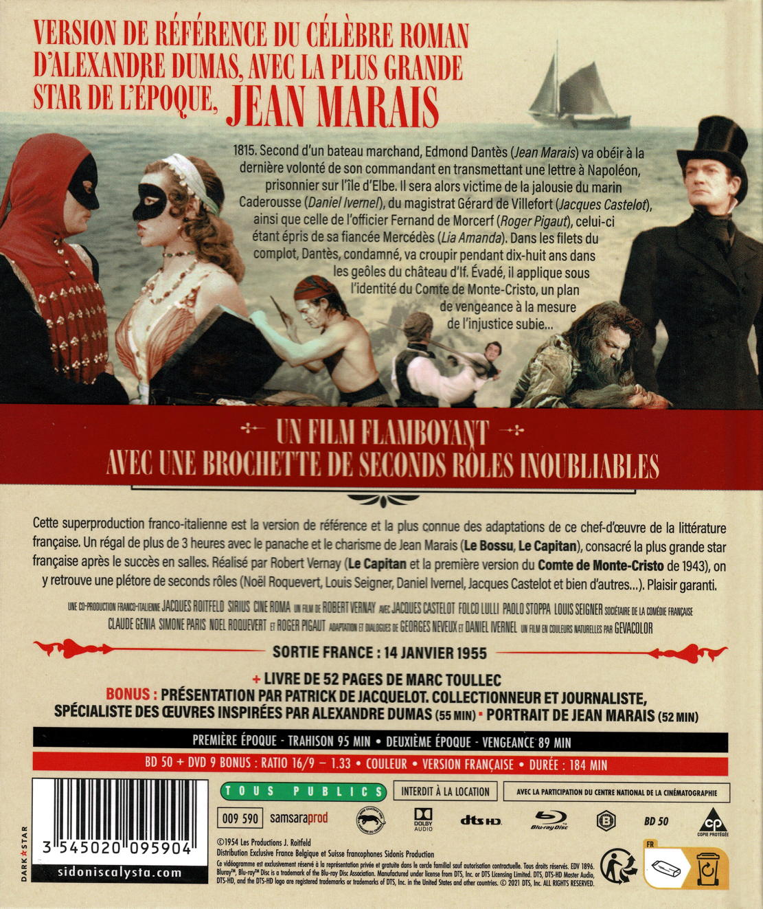 Réalisé par Robert Vernay en 1955, ce film fait partie des meilleures adaptations cinématographiques du chef d’œuvre de Dumas. Cette réédition au format Blu-Ray est présentée dans un beau coffret incluant un livret de 52 pages richement illustré consacré aux multiples films tirés du roman. Un DVD de bonus comprend une présentation du mythe Monte-Cristo par Patrick de Jacquelot illustrée par les collections de romans, bandes dessinées et objets dérivés de pastichesdumas, ainsi qu’un portrait de Jean Marais. Éditions Sidonis Calysta.